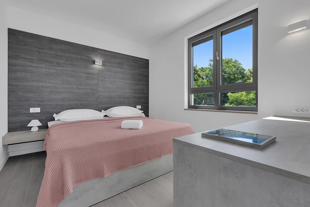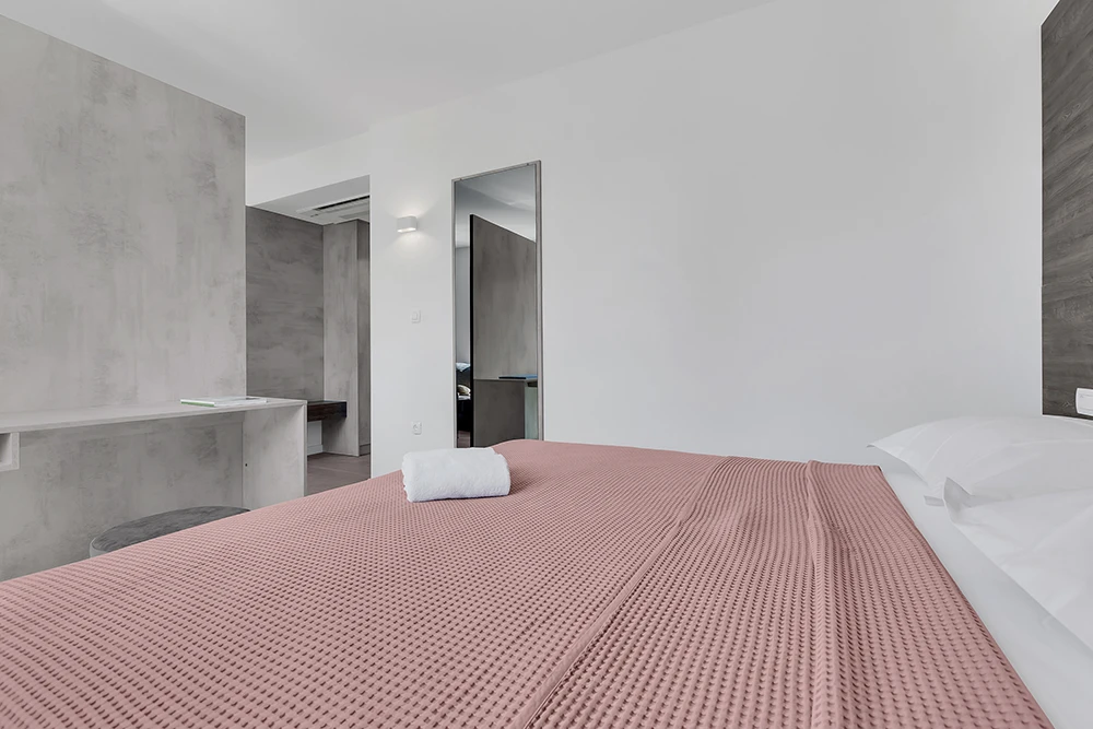 hotel-style double bed (200 × 180 cm). The space is air-conditioned and includes