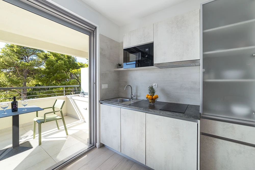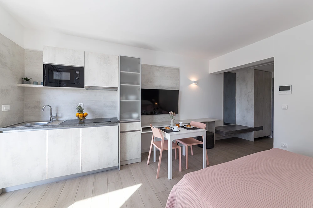 The mini kitchen is fully equipped and includes a refrigerator, dishwasher,